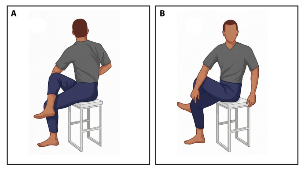 The seated lower back rotational stretch focuses on the glutes and piriformis muscles, which are the common cause of lower back pain. Sit down on the chair and cross one ankle over the other knee. Bend forward a little with your back straight and maintain the position for between 15 and 30 seconds. After that, switch to the other side.