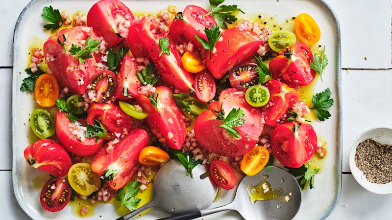 This salad is very simple, but the secret ingredient is time. Allowing the dressing to sit draws more flavour from the tomatoes.